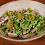 Incorporer les pâtes cuites à la poêle ainsi qu’une louche d’eau de cuisson.Couper la chaleur et monter au beurre. Garnir avec les oignons verts et poivre du moulin.