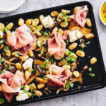 Ajouter les tranches de prosciutto par ci par là et la mini roquette.Garnir avec le fromage ricotta un peu partout sur la plaque de gnocchi croustillants.Déguster aussitôt !!!