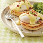 Déposer une tranche de jambon sur la moitié de muffins anglais grillée, puis un oeuf. Napper de sauce hollandaise et servir aussitôt.