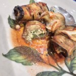Placer un peu de farce, soit l'équivalent d'une cuillère à soupe dans chaque tranche d'aubergine puis les rouler.Placer les rouleaux d'aubergines en spirale dans un plat allant au four et alterner avec les morceaux d'oignons.