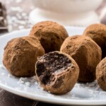 Verser la pâte de chocolat sur une plaque pour la faire refroidir. Lorsqu'elle a atteint une consistance moelleuse, introduire dans une poche munie d'une douille ronde n°10 et déposez de petits tas de chocolat sur une feuille de papier cuisson. Laissez-les durcir 1 h au réfrigérateur. (Vous pouvez aussi procéder à la cuillère et rouler à la main)
