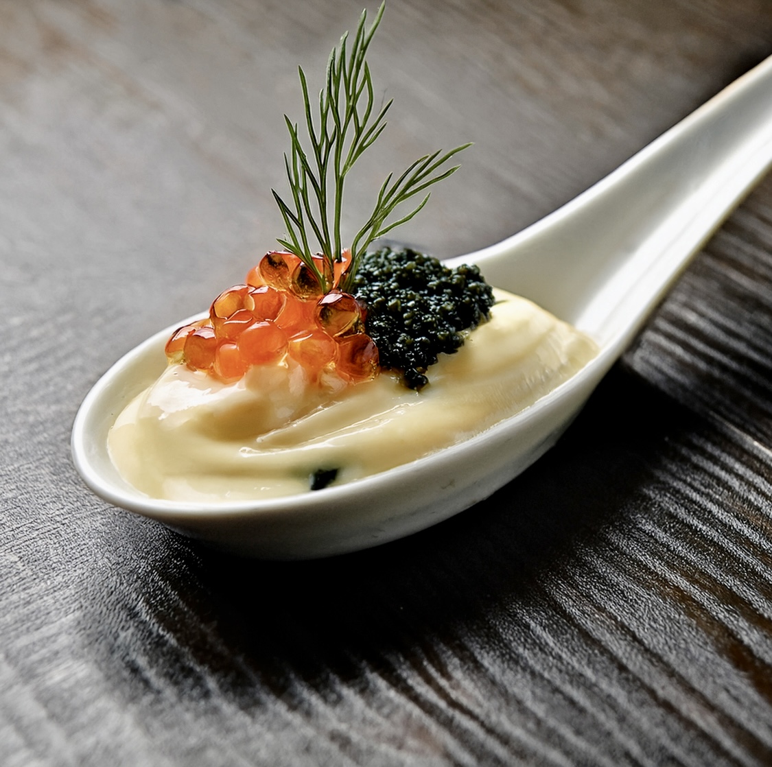 Cette élégante mise en bouche marie la douceur veloutée d'une mousseline de pommes de terre aux notes iodées des œufs de poisson. Sublimée par des touches aromatiques subtiles, cette bouchée festive révèle un équilibre parfait entre texture crémeuse et éclats perlés.