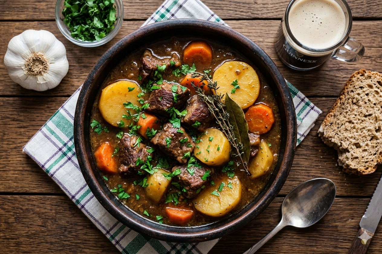 Le rite du service irlandais. En Irlande, l’Irish Stew se sert invariablement avec du Soda Bread (pain de soude irlandais) ou du Brown Bread pour absorber la sauce généreuse. Cette association est au cœur de l’expérience culinaire irlandaise. Pour une touche festive de Saint-Patrick, servez avec une Guinness fraîche bien tirée — la mousse crémeuse contraste magnifiquement avec la richesse du mijoté.