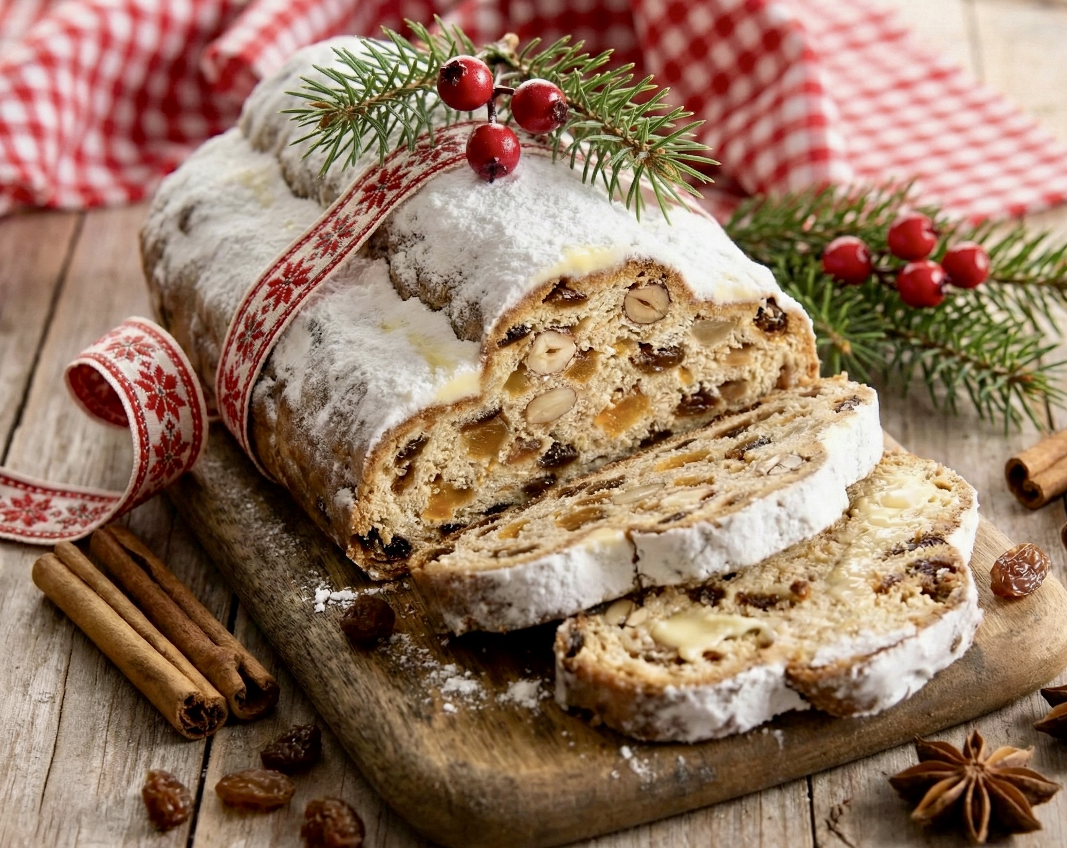 Originaire d’Allemagne mais profondément ancré dans les traditions alsaciennes, le Stollen est un pain brioché riche en fruits secs, noix et épices, généreusement saupoudré de sucre glace. Il est consommé pendant la période de l’Avent et le jour de Noël.
