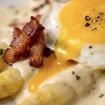Asperges blanches au beurre noisette, velouté au parmesan et aux pelures, lardon fumé croustillant, œuf coulant