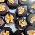 Sortir les boules de noix et dattes du congélateur, et plonger les dans le chocolat fondant une à une.Réserver sur une plaque recouverte de papier parchemin et ajouter une demi-noix sur le dessus.Laisser tempérer une vingtaine de minutes avant de les manger.