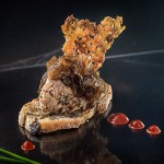 Effiloché de canard, confit d'échalotes à la bière et chips de fromage