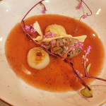 Tartare de canard à l'ail noir et eau de tomates aux épices