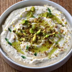 Juste avant de servir, transférer dans une jolie assiette creuse, arroser d’un filet d’huile d’olive, saupoudrer de paprika, ajouter quelques pistaches concassées restantes et quelques feuilles d’herbes fraîches.